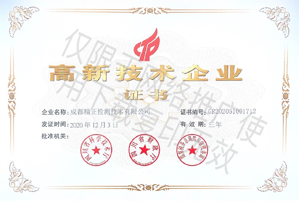 成都精正檢測技術有限公司順利通過國家高新技術企業(yè)認定。獲得由四川省科學技術廳、四川省財政廳、國家稅務局四川省稅務局聯(lián)合簽發(fā)的高新技術企業(yè)證書。發(fā)證日期:2020年12月3日,證書編號:GR202051001712,有效期:三年。